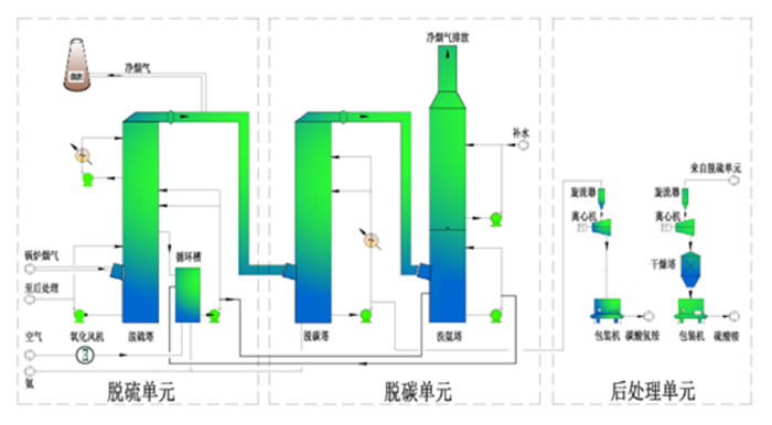 | Coal, oil, and natural gas, all containing sulfur and carbon, and SO2 and CO2 are produced after high-temperature combustion, which pollute the environment, and cause global temperature rise and huge crisis to human survival. JNG ADSC technology is to integrate ammonia decarbonization technology with ammonia desulfurization technology, using desulfurization solution to absorb the ammonia slip in the decarbonized tail gas and return to desulfurization unit. ADSC technology effectively controls the ammonia slip in the decarbonized process, and converts SO2 and CO2 in the flue gas into ammonium sulfate and ammonium bicarbonate fertilizers. |
