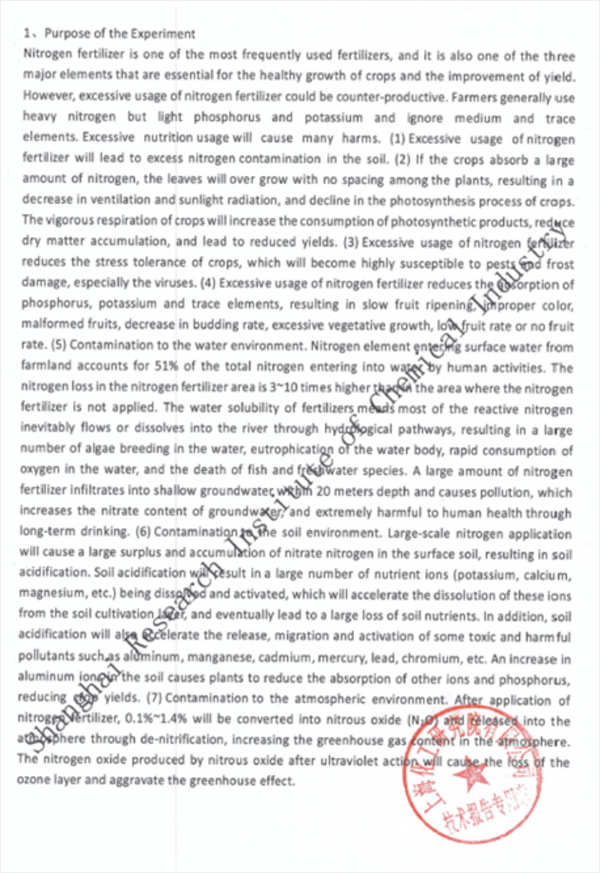 | JNG and Shanghai Chemical Research Institute Co., Ltd. Jointly studied the application effect of high ammonium sulfate and ammonium carbide-based compound fertilizer, and the study showed that the use of ammonium sulfate and ammonium bicarbonate with low nitrogen and low cost can avoid the problem of nitrogen excess caused by the use of high nitrogen urea. An excerpt from the test report is shown as follows: |