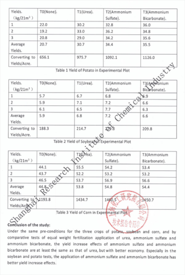 | The study compared the agricultural application effects of high ammonium sulfate and high ammonium bicarbonate content compound fertilizer with conventional urea-based compound fertilizer through the experimental plot by equal fertilization method for potatoes, soybeans, corn and other crops. The yield data of the experimental plot is excerpted below: |