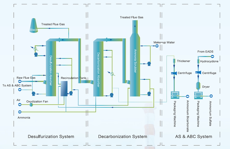 | The flue gas enters the decarbonization system. The carbon dioxide in the flue gas is absorbed by ammonia through circulating spraying, forming ammonium bicarbonate slurry. The ammonium bicarbonate slurry is thickened, centrifuged, and packaged to obtain ammonium bicarbonate fertilizer product. |