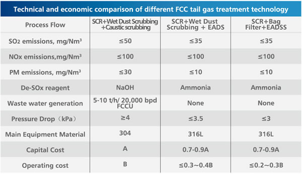 | The typical FCC flue gas treatment process is SCR for NOx removal and caustic scrubbing process for SO2 and PM removal. Compared to the conventional process, JNG¡¯s IFGT technology saves 10%~30% of the capital cost and more than 50% of the operating cost while achieving the same air pollution control efficiency (SO2 emission ¡Ü 50 mg/Nm3, can reach to 35 mg/Nm3, NOx emission ¡Ü 100 mg/Nm3, PM emission ¡Ü 10 mg/Nm3). Besides, the system generates no salty waste water, no secondary treatment costs, and the byproduct ammonium sulfate. |