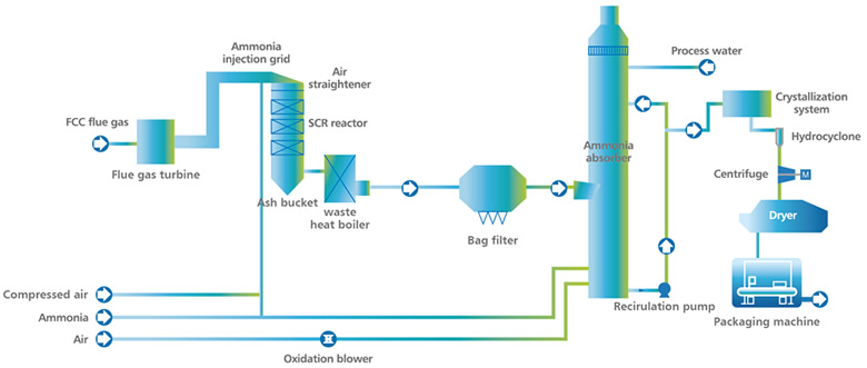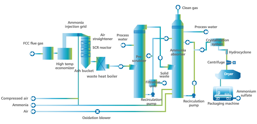 | Flue gas from the FCC catalyst regeneration process recovers thermal energy through an expander and waste heat recovery boiler before entering the SCR (Selective Catalytic Reduction) reactor at a specified (300¡æ~420¡æ) temperature. In the presence of the SCR catalyst, NOx in the flue gas reacts with ammonia and produces N2 and H2O. After NOx removal, the flue gas goes through low temperature waste heat recovery boiler, and then is fed into the bag filter to remove particulates and then to the ammonia absorber to remove SO2. After the cooling, scrubbing, absorption and demisting steps, the clean flue gas is discharged from stack above the absorber. The product of the initial reaction between SO2 and the ammonia-based absorbent is ammonium sulfite. Through oxidation and concentration, ammonium sulfite in the aqueous solutions converted into ammonium sulfate with a precisely controlled concentration. The ammonium sulfate slurry is further processed in the hydrocyclone, the centrifuge, and the dryer to yield ammonium sulfate with water content less than 1%. The ammonium sulfate is then packaged in the packaging machine and palletized as fertilizer-grade ammonium sulfate product. Besides, There is no waste water generated in the whole procedure. |