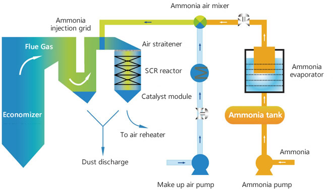 | In the SCR denitrification process, NOx in the flue gas reacts selectively with the reductant and produces N2 and H2O with the presence of V2O5/TiO2 based catalysts at a temperature of 300 to 420 ≧. The reductant is typically anhydrous ammonia, aqueous ammonia or urea. The reaction using ammonia (anhydrous/aqueous) as the reductant for a SCR process is described as follows: