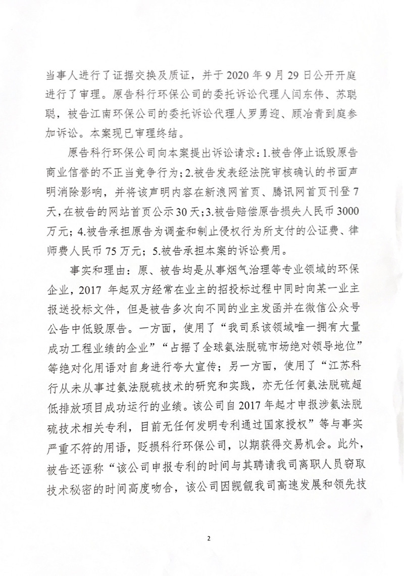 On December 22, 2020, JNG China received the civil judgment of Nanjing Intermediate People's Court in Jiangsu Province ((2019) Su, 01, Civil, First Instance, Document Number 3365). The judgement held that the letter of complaint sent by Jiangnan Environmental Protection Company in the bidding process, as well as the announcement in the lawsuit, were neither disinformation nor misinformation, but were acts of right remedy in accordance with the law for the legitimate purpose of safeguarding its own intellectual property rights, neither improper nor illegal, so they did not constitute business slander. The judgement held that the claims of the plaintiff, Jiangsu Cohen Environmental Protection Co., Ltd., were dismissed, and that the case acceptance fee of 195,550 yuan should be borne by the plaintiff.