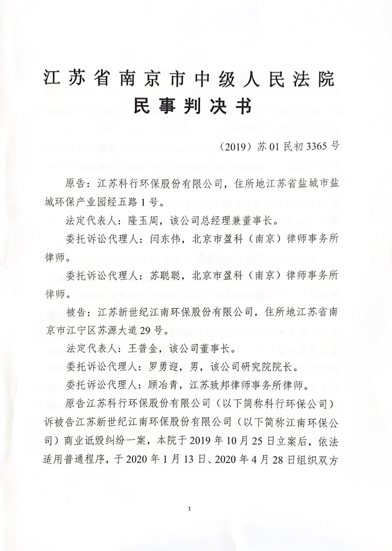 | Nanjing Intermediate People's Court Held that JNG China did not Constitute Unfair Competition and Dismissed All Claims of Jiangsu Cohen Environmental Protection Co., Ltd. |