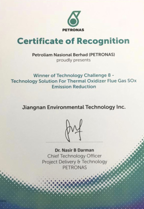 On February 17th, 2020, Petroliam National Berhad (short for Petronas) announced that JNG championed the technology challenge and today (March 4th), JNG received the Certificate of Recognition signed by Dr. Nasir B Darman, the CTO of Petronas, which indicates that JNG' s Efficient Ammonia-based Desulfurization Technology (EADS) has been fully recognized by Petronas. We really appreciate the trust that Petronas shows in JNG.