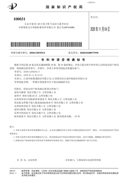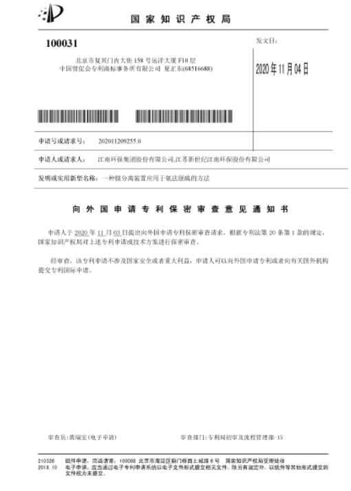 Recently, JNG China received a "Notification of Acceptance of Patent Application" and a "Notification of Opinions on Confidentiality Examination of Patent Applications to Foreign Countries" from China National Intellectual Property Administration regarding a domestic pending invention patent. This patent is titled "a method of membrane separation device for ammonia desulfurization" and the application number is "CN202011209255.0".