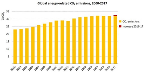 However, the news was generally bad for global energy-related CO2 emissions, which grew by 1.4 per cent in 2017 after three flat years, reaching a historic high of 32.5 gigatonnes.